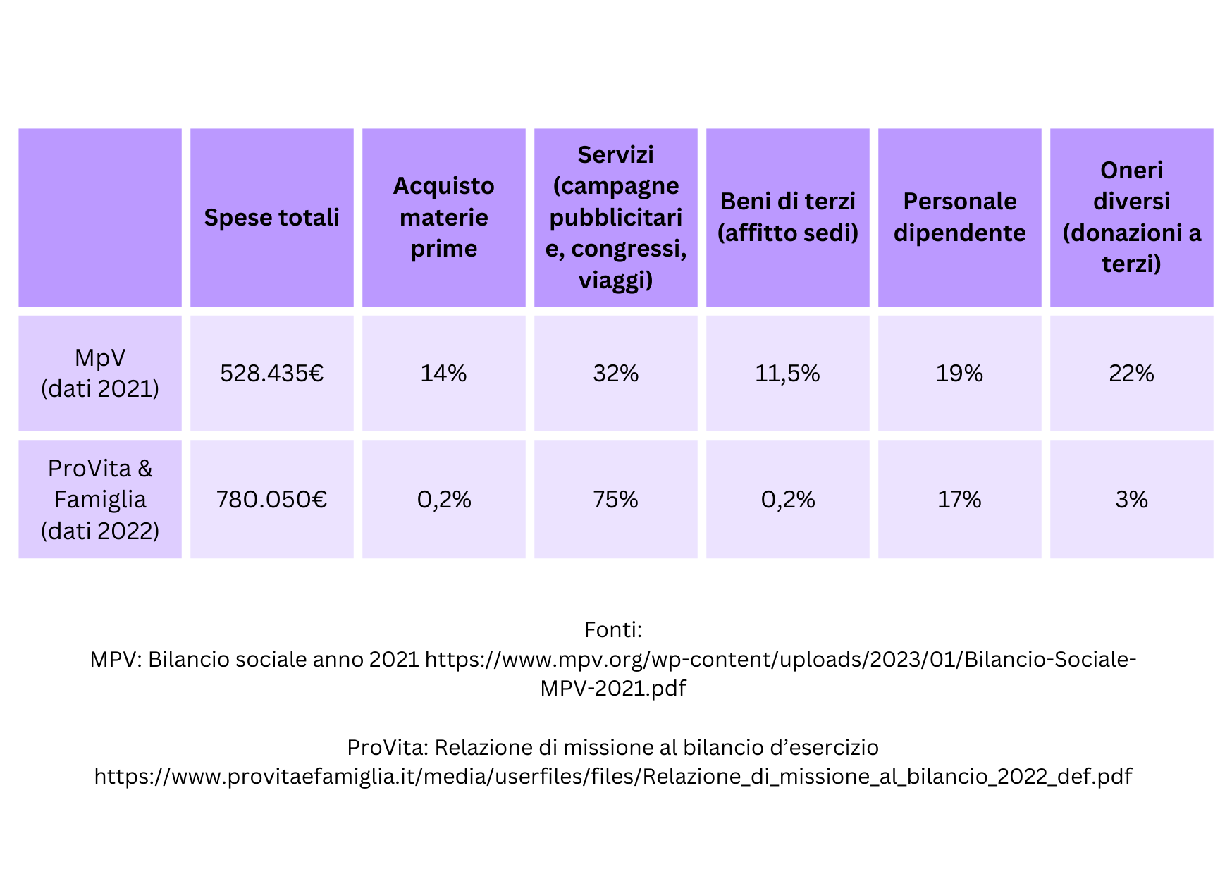 In altre parole, la maggiore spesa di ProVita & Famiglia sono le campagne pubblicitarie (75% del totale, oltre 500mila euro) e solo il 3% viene donato direttamente alle famiglie in difficoltà. Anche il MpV spende una cifra considerevole per i servizi, ma una buona fetta riguarda l’acquisto delle materie prime e le donazioni dirette, cioè il vero e proprio attivismo antiabortista dei Cav.