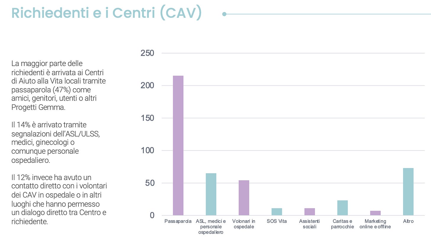 Oltre alla disinformazione scientifica, un’altra prassi degli antiabortisti è quella di fornire aiuti economici alle donne intenzionate ad abortire. La più famosa di queste iniziative è il Progetto Gemma della Fondazione Vita Nova (affiliata al MpV), presentato come un progetto di “adozione prenatale”: per 18 mesi l’associazione fornisce un contributo in denaro di 200€ al mese alla donna che decide di non abortire. Nel bilancio sociale di Fondazione Vita Nova si legge che il 14% delle donne arriva al Progetto Gemma su segnalazione del personale ospedaliero e il 12% tramite un contatto diretto con i volontari dei Cav negli ospedali.